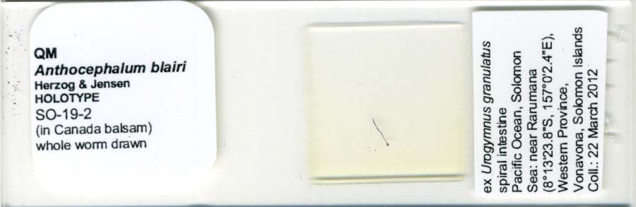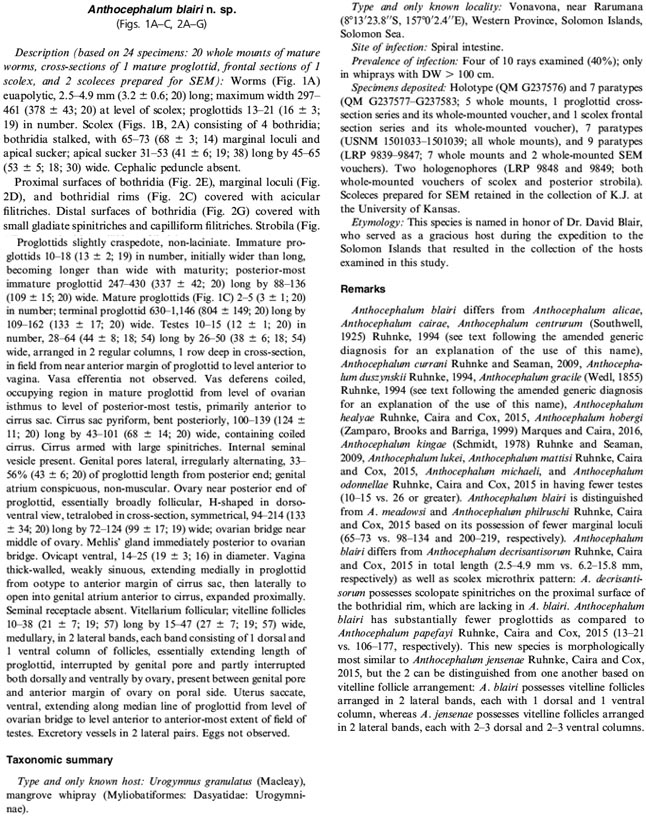 | Type Material | holotype (QM G237576); 7 paratypes (QM G237577–G237583; 5 whole mounts, 1 proglottid crosssection series and its whole-mounted voucher, and 1 scolex frontal section series and its whole-mounted voucher); 7 paratypes (USNM 1501033–1501039; all whole mounts); 9 paratypes (LRP 9839–9847; 7 whole mounts and 2 whole-mounted SEM vouchers). |