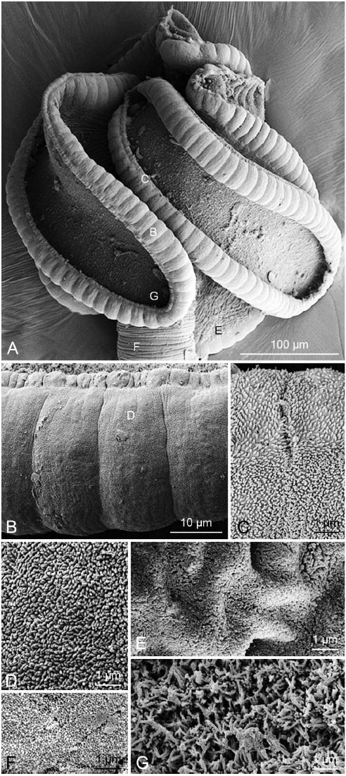 FIGURE 2. Scanning electron micrographs of Anthocephalum blairi n. sp. (A–G). (A) Scolex; letters indicate locations of Figure 2B–C, E–G. (B) Marginal loculi; letter indicates location of Figure 2D. (C) Proximal surface of marginal loculus adjacent to bothridial rim. (D) Proximal surface of marginal loculus away from bothridial rim. (E) Proximal surface of bothridium. (F) Surface of strobila. (G) Distal surface of bothridium.
