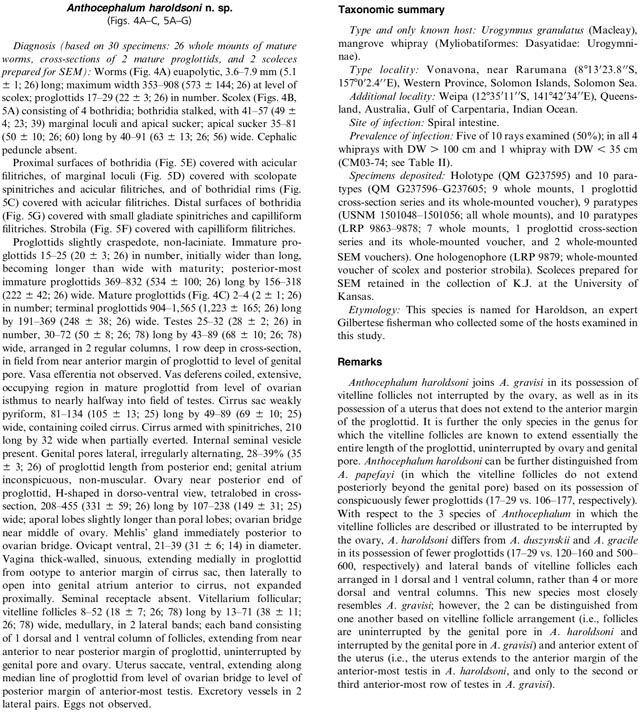 | Type Material | holotype (QM G237595); 10 paratypes (QM G237596–G237605; 9 whole mounts, 1 proglottid cross-section series and its whole-mounted voucher); 9 paratypes (USNM 1501048–1501056; all whole mounts); 10 paratypes (LRP 9863–9878; 7 whole mounts, 1 proglottid cross-section series and its whole-mounted voucher, and 2 whole-mounted SEM vouchers). |