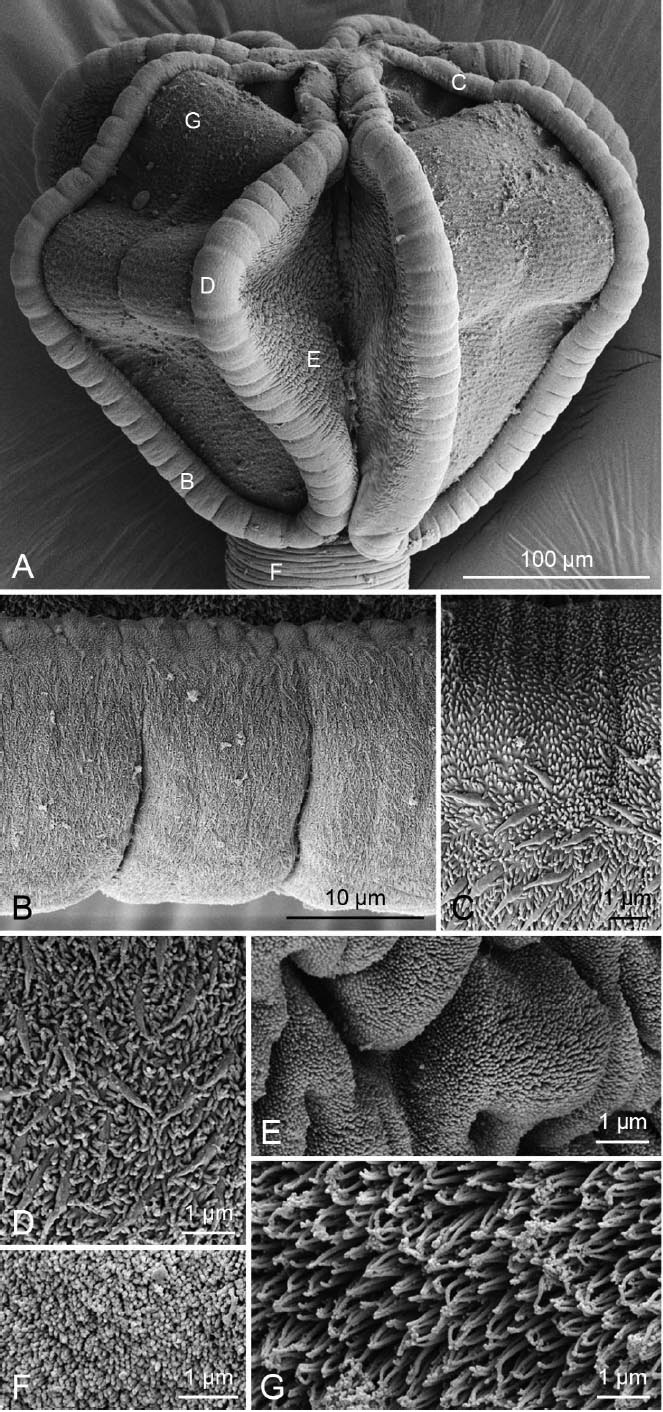 FIGURE 5. Scanning electron micrographs of Anthocephalum haroldsoni n. sp. (A–G). (A) Scolex; letters indicate locations of Figure 5B–G. (B) Marginal loculi. (C) Proximal surface of marginal loculus adjacent to bothridial rim. (D) Proximal surface of marginal loculus away from bothridial rim. (E) Proximal surface of bothridium. (F) Surface of strobila. (G) Distal surface of bothridium.