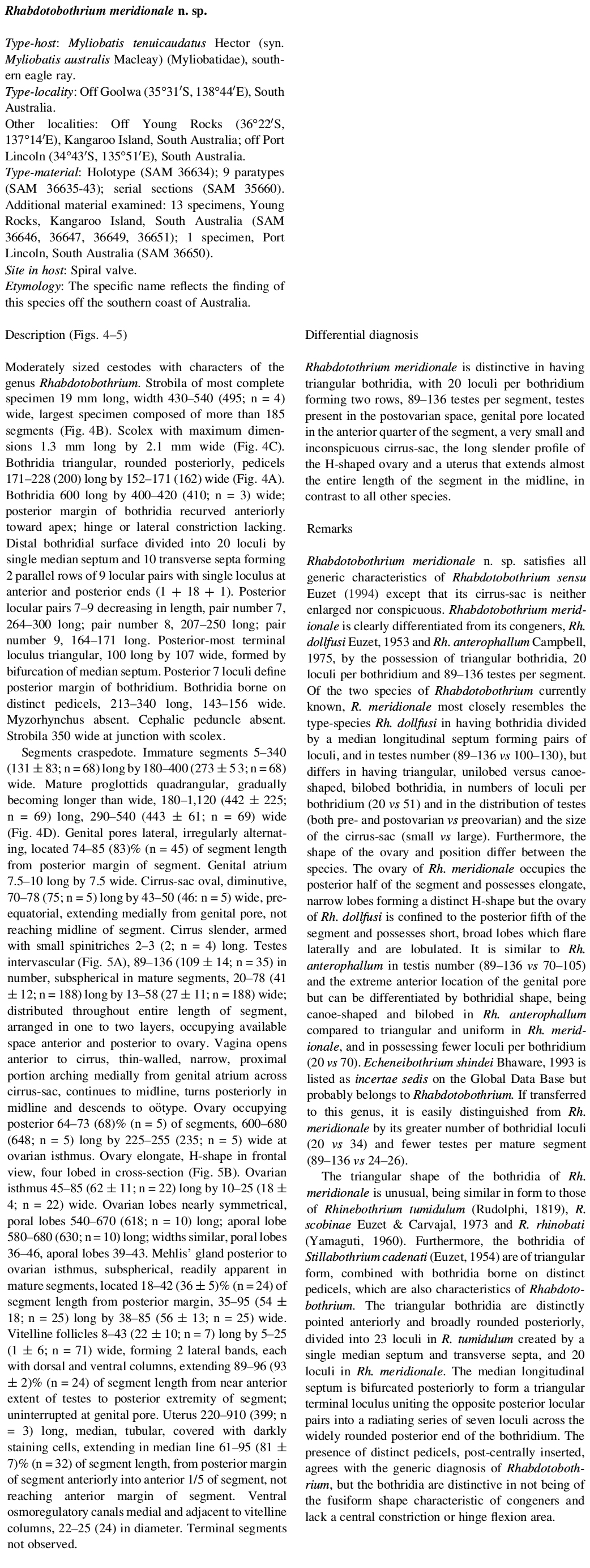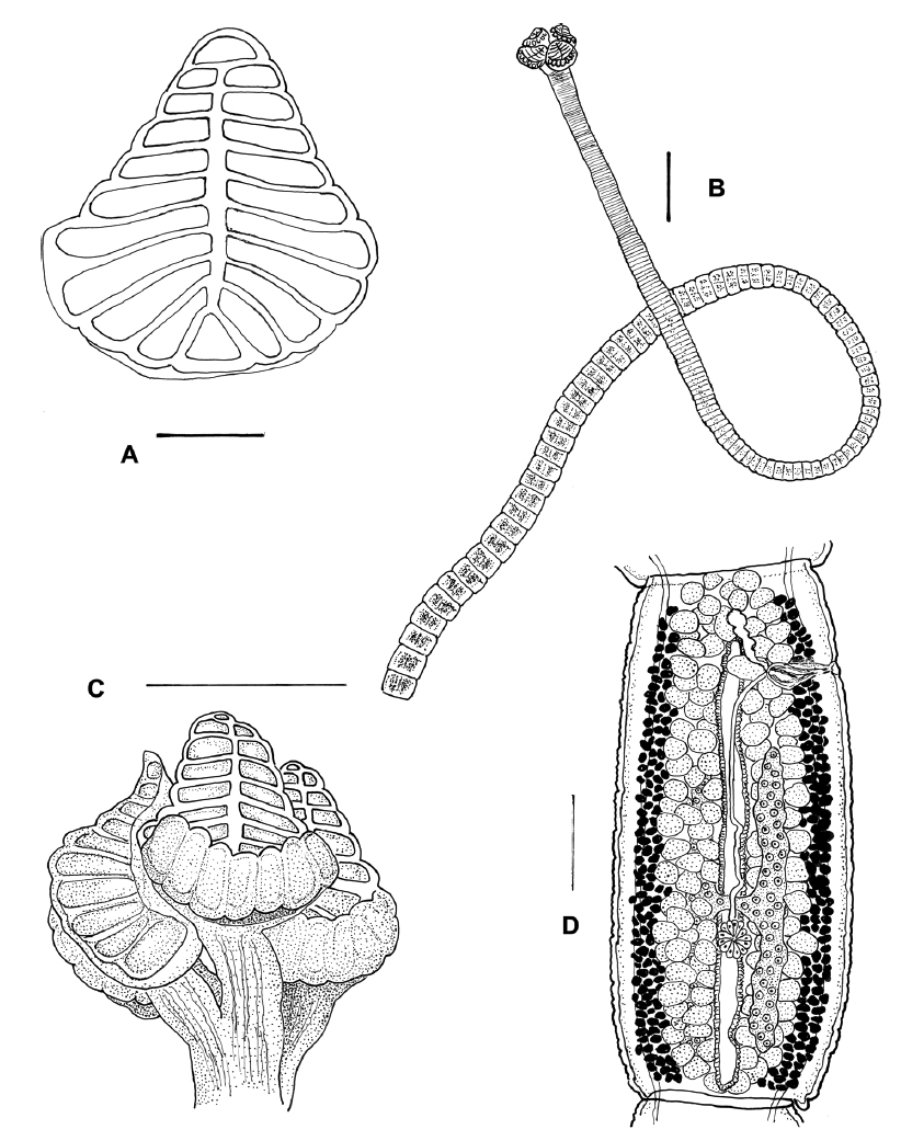 Fig. 4 Rhabdotobothrium meridionale n. sp. from Myliobatis tenuicaudatus Hector (Myliobatidae). A, Bothridium; B, Entire cestode; C, Scolex; D, Mature segment. Scale-bars: A, 1 mm; B, D, 200 µm; C, 500 µm.
