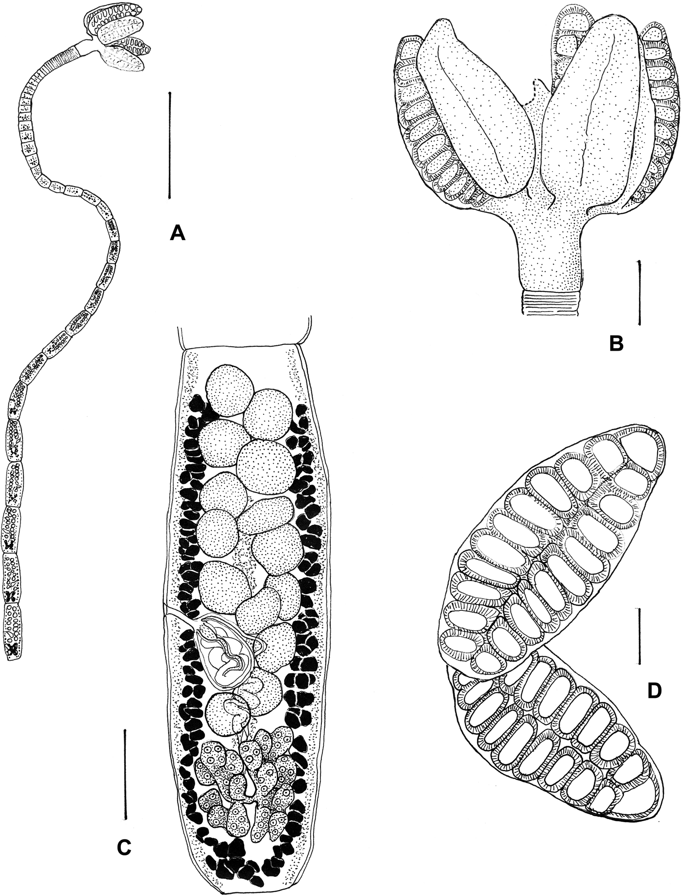 Fig. 6 Rhabdotobothrium anoxypristidis n. sp. from Anoxypristis cuspidatus (Latham) (Pristidae). A, Entire cestode; B, Scolex; C, Mature segment; D, Bothridia. Scale-bars: A, 1 mm; B, 200 µm; C, D, 100 µm.