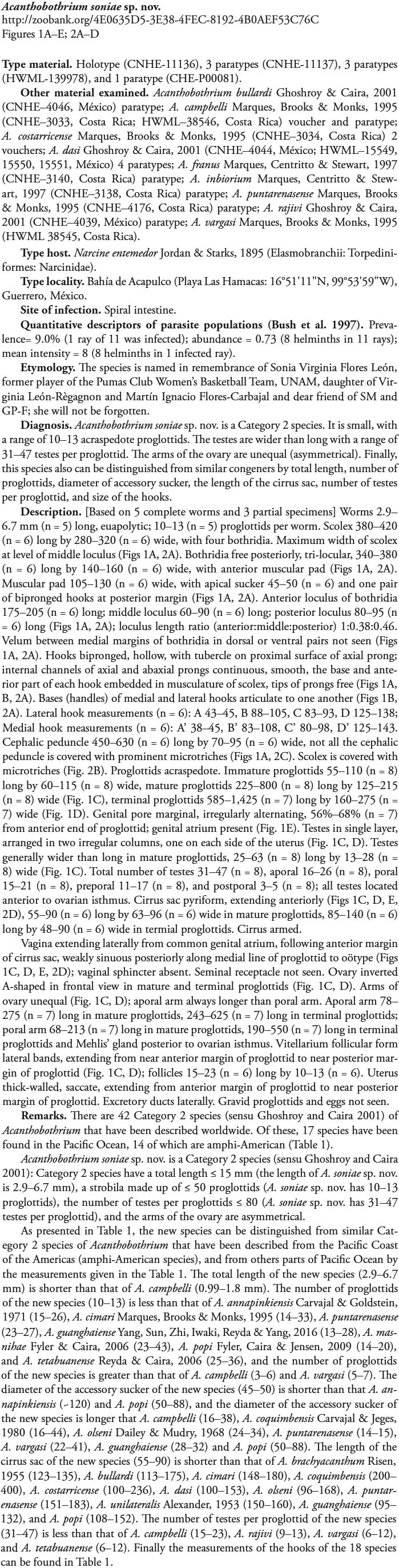 Zaragoza-Tapia, F., G. Pulido-Flores, J. Violante-González, and S. Monks. 2019. Two new species of Acanthobothrium Blanchard, 1848 (Onchobothriidae) in Narcine entemedor Jordan & Starks, 1895 (Narcinidae) from Acapulco, Guerrero, Mexico. ZooKeys 852: 1–21. (7128) Download PDF |