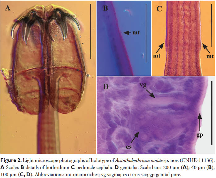 Figure 2. Light microscope photographs of holotype of Acanthobothrium soniae sp. nov. (CNHE-11136). A Scolex B details of bothridium C peduncle cephalic D genitalia. Scale bars: 200 μm (A); 40 μm (B), 100 μm (C, D). Abbreviations: mt microtriches; vg vagina; cs cirrus sac; gp genital pore.