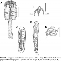 Figure 1. Holotype of Acanthobothrium soniae sp. nov. (CNHE-11136). A Scolex B hooks C mature proglottid D terminal proglottid E genitalia. Scale bars: 200 μm (A, D); 100 μm (B, E); 150 μm (C).