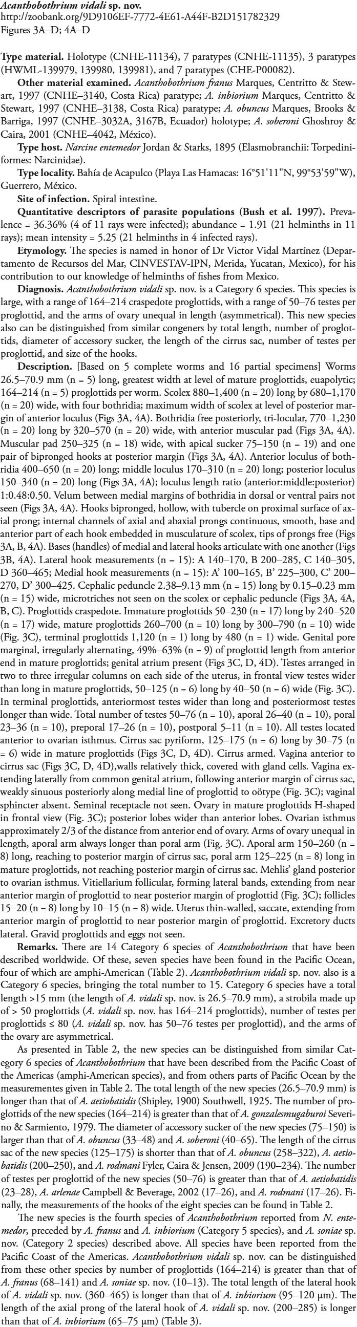 Zaragoza-Tapia, F., G. Pulido-Flores, J. Violante-González, and S. Monks. 2019. Two new species of Acanthobothrium Blanchard, 1848 (Onchobothriidae) in Narcine entemedor Jordan & Starks, 1895 (Narcinidae) from Acapulco, Guerrero, Mexico. ZooKeys 852: 1–21.