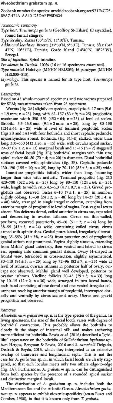 Boudaya, L., L. Neifar, and L. Euzet. 2018. A new genus and three new species of Anthocephaliidae (Cestoda, Rhinebothriidea) from the round fantail stingray, Taeniurops grabata (Chondrichthyes, Dasyatidae) from the Mediterranean Sea and Atlantic Ocean. Journal of Helminthology : 1–11. (7129) Download PDF |