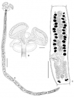 Fig. 2. Alveobothrium grabatum sp. n. (A) entire worm; (B) scolex, ventral view; (c) mature proglottid, dorsal view. Scale bars: A = 500 µm; B, C = 100 µm.