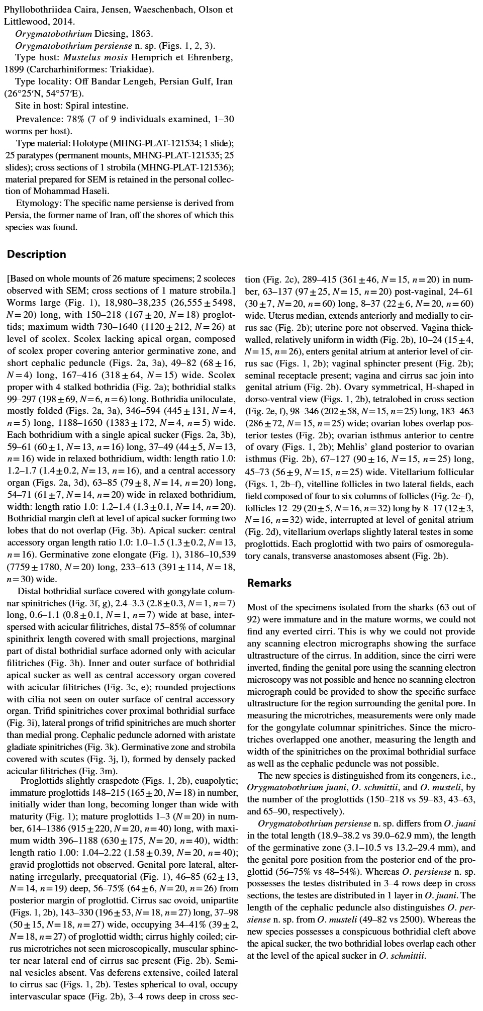 Ebrahimi Moghadam, F. E. and M. Haseli. 2019. Orygmatobothrium persiense n. sp. (Cestoda: Phyllobothriidea) from the Arabian Smooth‑Hound Shark Mustelus mosis (Triakidae) in the Persian Gulf. Acta Parasitologica 64: .