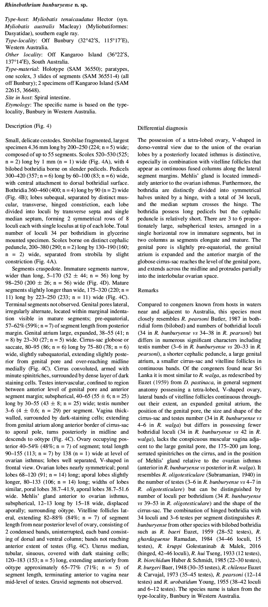 | Type Material | Holotype (SAM 36550); paratypes, one scolex, 3 slides of segments (SAM 36551-4) (all off Bunbury); 2 specimens off Kangaroo Island (SAM 22615, 36648). |