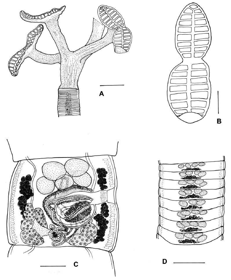 Fig. 4 Rhinebothrium bunburyense n. sp. from Myliobatis tenuicaudatus. A, Scolex; B, Surface of bothridium; C, Mature segment; D,