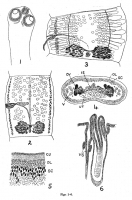 Figs. 1-6. Proteocephalus tigrinus. CU, cuticle; IS, isthmus of ovary; OL, outer (subcuticular) layer of longitudinal muscle; OV, ovary; SC, nuclear layer of subcuticula; UT, uterus; V, vitellaria; VS, vaginal sphincter. Fig. 1. Scolex. (x116.). Fig. 2. Mature proglottid, slightly fattened. Ventral view. (x52.). Fig. 3. Ripe proglottid, much fattened. Dorsal view. Note great width of the median chamber of the uterus, in part due to flattening. The eggs are not shown. (x36.). Fig. 4. Transverse section across a young ripe proglottid in the region of the ovary. Note the absence of an internal longitudinal muscle sheath and the presence of the egg-filled uterus ventral to the ovary. (x74.). Fig. 5. The body wall seen in transverse section. (x213.). Fig. 6. The vaginal aperture and the partly-protruded cirrus seen in a horizontal section. (x240.).