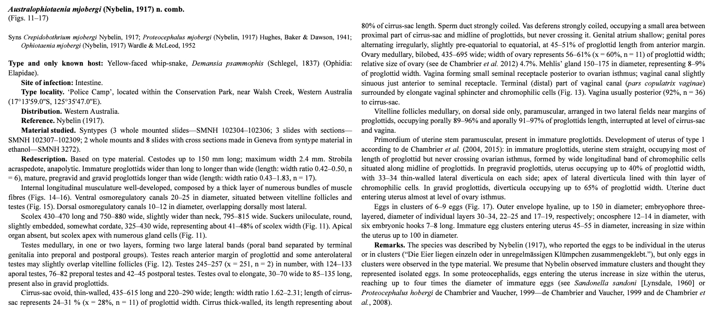 Nybelin, O. 1917. Results of Dr. E. Mjöbergs Swedish Scientific Expeditions to Australia 1910-1913 XIV. Australische Cestoden. Kungliga Svenska Vetenskapsakademiens Handlingar 52 (14) : 4-48. (3984) Download PDFde Chambrier, A., I. Beveridge, and T. Scholz. 2018. Tapeworms (Cestoda: Proteocephalidae) of Australian reptiles: hidden diversity of strictly host-specific parasites. Zootaxa 4461(4): 477–498. (7179) Download PDF |