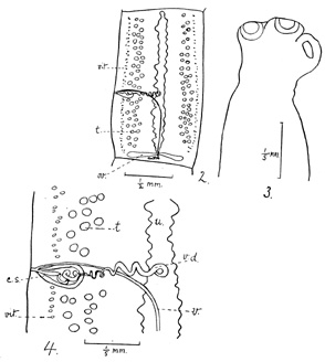 Plate VI. Fig. 2. Segment of Acanthotaenia (Ophiotaenia) striata from Lialis burtonii. Fig. 3. Scolex of A. striata - distorted view, showing three of the suckers. Fig. 4. Part of segment of A. striata.