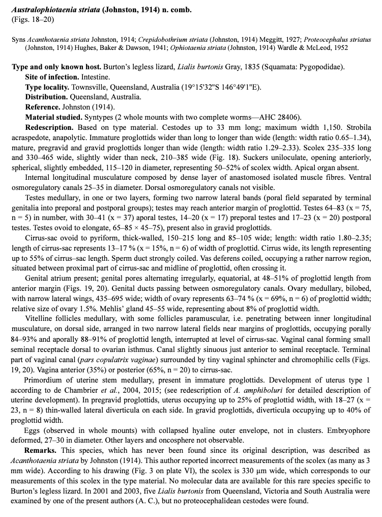 Johnston, T. H. 1914. Second report on the Cestoda and Acanthocephala collected in Queensland. Annals of Tropical Medicine and Parasitology 8: 105-112 + Plate . (3985) Download PDFde Chambrier, A., I. Beveridge, and T. Scholz. 2018. Tapeworms (Cestoda: Proteocephalidae) of Australian reptiles: hidden diversity of strictly host-specific parasites. Zootaxa 4461(4): 477–498. (7179) Download PDF |