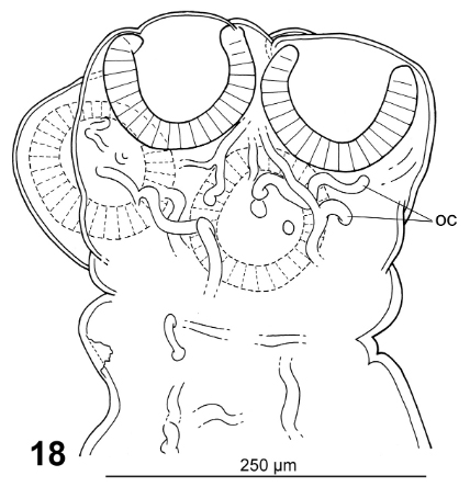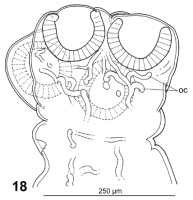From de Chambrier, Beveridge & Scholz, 2018 (Cit# 7179). FIGURE 18. Australophiotaenia striata (Johnston, 1914) n. comb., syntype from Townsville, Queensland, Australia [Coll. No. AHC 28406.], scolex.