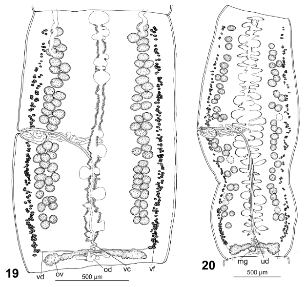 From de Chambrier, Beveridge & Scholz, 2018 (Cit# 7179). FIGURES 19, 20. Australophiotaenia striata (Johnston, 1914) n. comb., syntype from Townsville, Queensland, Australia [Coll. No. AHC 28406.] 19. Mature proglottid, ventral view. 20. Pregravid proglottid, dorsal view.