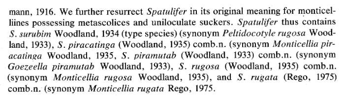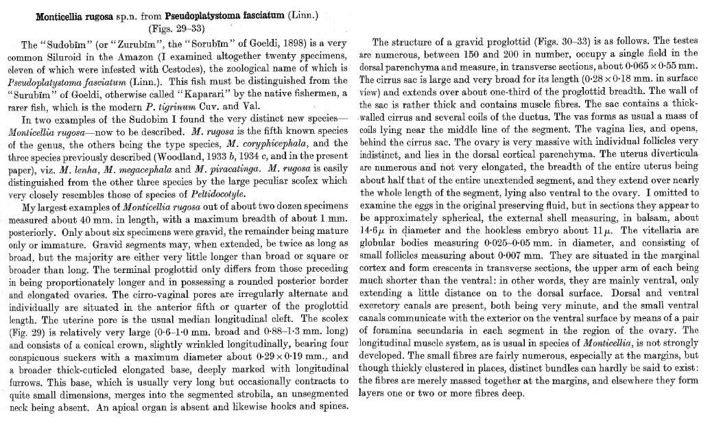 Woodland, W. N. F. 1935. Some more remarkable cestodes from Amazon siluroid fish. Parasitology 27: 207-225 + Plates. (3965) Download PDFBrooks, D. R. and T. L. Deardorff. 1980. Three proteocephalid cestodes from Colombian siluriform fishes, including Nominoscolex alovarius sp. n. (Monticelliidae: Zygobothriinae). Proceedings of the Helminthological Society of Washington 47: 15-21. (4023) Download PDF |