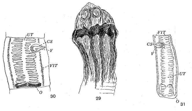 Plate IV. Fig. 29 (X27): the scolex in side aspect. Fig. 30 (X27): a gravid proglottid of normal shape (testes not shown). Fig. 31 (X17): elongated gravid proglottid in outline (testes not shown).