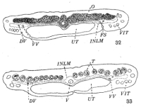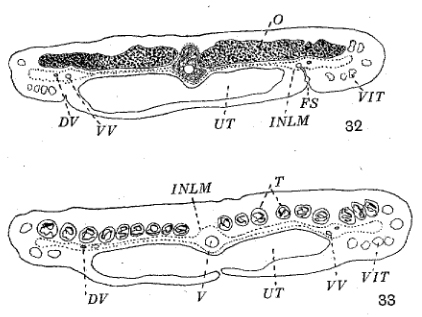 Plate IV. Fig. 32 (X56): transverse section of gravid proglottid in region of ovary (intra-uterine eggs not shown). Fig. 33 (X56): transverse section of gravid proglottid anterior to ovary (eggs not shown).