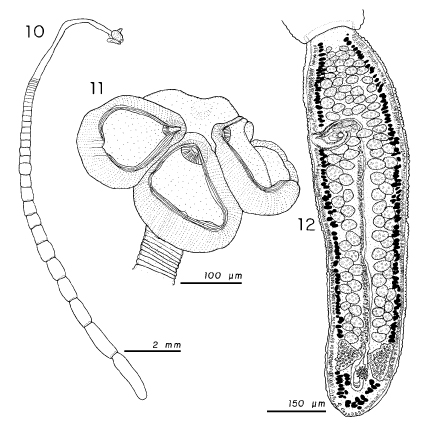 Figures 10–12. Paraorygmatobothrium arnoldi n. sp. from the Sicklefin lemon shark, Negaprion acutidens, collected from Dundee Beach, Australia. 10. Entire worm. 11. Scolex. 12. Terminal proglottid.