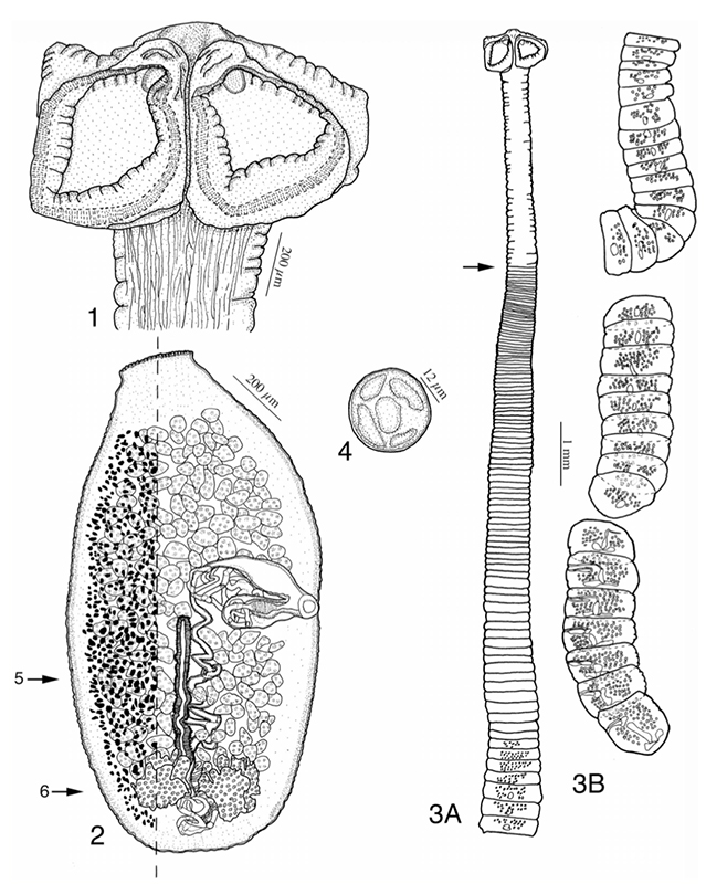 From Reyda, 2008 (Cit# 4447). Figures 1-4. Line drawings of Nandocestus guariticus (Marques, Brooks and Lasso, 2001) n. gen. n. comb. (1) Scolex. (2) Free mature proglottid. Arrows indicate locations of sections shown in Figures 5-6. (3) Anterior (A) and posterior (B) portions of whole worm. Arrows indicate approximate posterior extent of cephalic peduncle. (4) Egg.