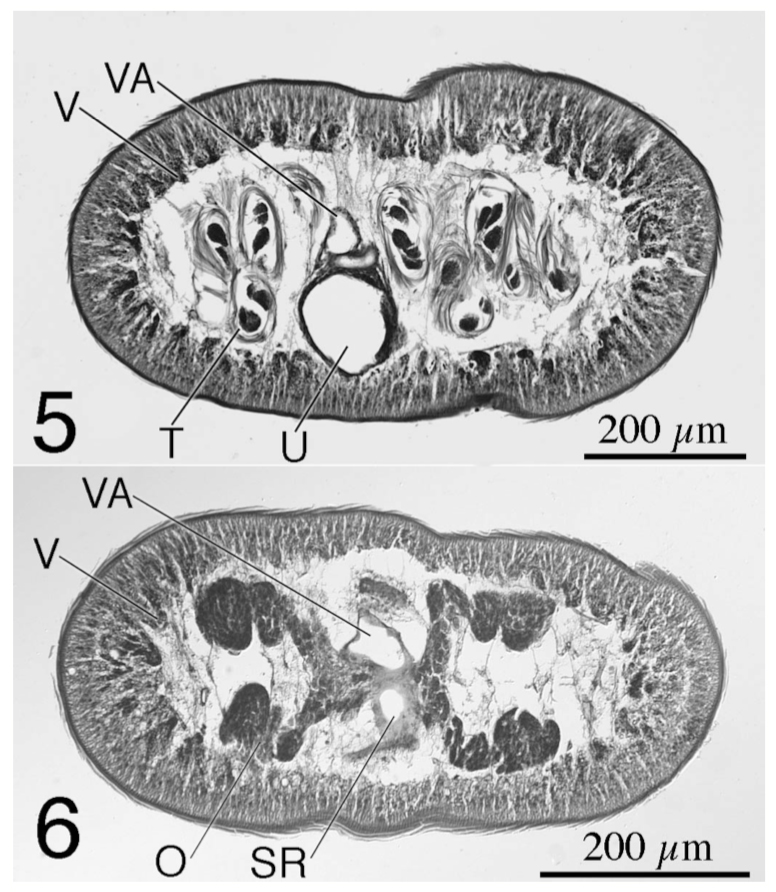 From Reyda, 2008 (Cit# 4447). Figures 5-6. Cross sections through mature proglottid of Nandocestus guariticus (Marques, Brooks and Lasso, 2001) n. gen. n. comb. (5) Section between ovary and cirrus sac showing arrangment of testes. (6) Section through ovarian bridge. Ovary (O); seminal receptacle (SR); testes (T); uterus (U); vitellaria (V); vagina (VA).
