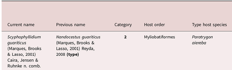 | Synonyms | Anindobothrium guariticus Marques, Brooks & Lasso, 2001; Nandocestus guariticus (Marques, Brooks & Lasso, 2001) Reyda, 2008 |