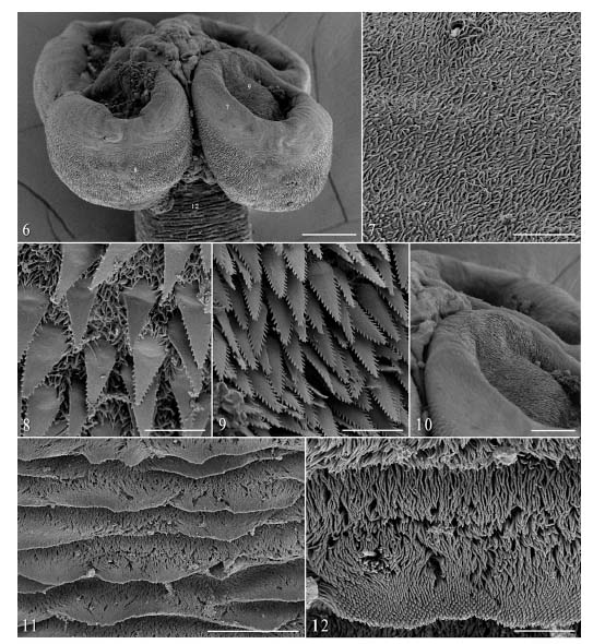 Figs. 6-12. Scanning electron micrographs of Doliobothrium haselii n. gen. n. sp. 6.