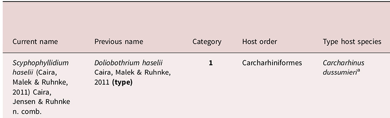 | Synonyms | Doliobothrium haselii Caira, Malek & Ruhnke, 2011 |