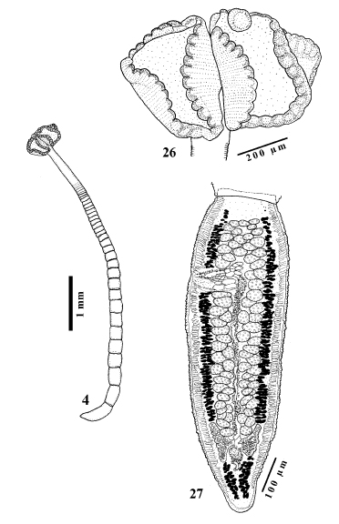 Fig. 4. O. kelleyae n. sp., entire holotype (MZUM(P) No. 164(h)). Figs 26-27 O. kelleyae n. sp. 26. Scolex of holotype (MZUM(P) No. 164(h)). 27. Terminal proglottid of paratype (LRP No. 3886)