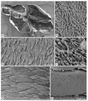 36. Proximal surface of bothridium at marginal loculus. 37. Distal surface of bothridum; iInset shows enlarged view of microtriches. 38. Scutes on anterior regions of strobila. 39. Enlarged view of scutes; note scutes composed of elongate filitriches. Scale-bars: 34, 200 µm; 35–37,39, 2 µm; 37(inset), 1 µm; 38, 20 µm.