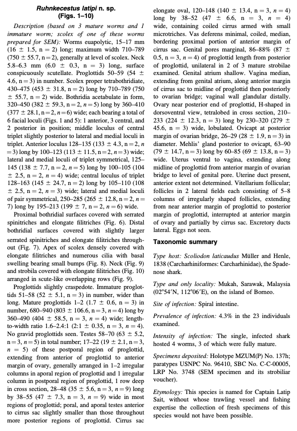 Caira, J. N., K. Jensen, C. Hayes and T. R. Ruhnke. 2020. Insights from new cestodes of the crocodile shark, Pseudocarcharias kamoharai (Lamniformes: Pseudocarchariidae), prompt expansion of Scyphophyllidium and syonymization of seven phyllobothriidean genera—at last!. Journal of Helminthology (https://doi.org/10.1017/S0022149X20000036): 1–24.