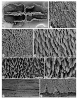 Figs. 16–23 Scanning electron micrographs of Orectilobicestus lorettae n. sp. 16. Scolex. White numbers indicate locations at which Figs. 17–22 were taken. 17. Detail of lateral portion of apical sucker. Note microthrix differences between distal surface of sucker, margin of sucker and proximal surface of bothridium. 18. Proximal surface of bothridium, not on surface of marginal loculus. 19. Proximal surface of bothridium at marginal loculus. 20. Distal surface of bothridium. 21. Enlarged view of distal surface of bothridium. 22. Scutes on anterior regions of strobila. 23. Enlarged view of scutes; note scutes composed of elongate filitriches. Scale-bars: 16, 200 µm; 17, 10 µm; 18–20,23, 2 µm; 21, 1 µm; 22, 20 µm