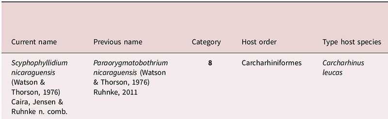 Synonyms Phyllobothrium nicaraguensis Watson & Thorson, 1976; Paraorygmatobothrium nicaraguensis (Watson & Thorson, 1976) Ruhnke, 2011