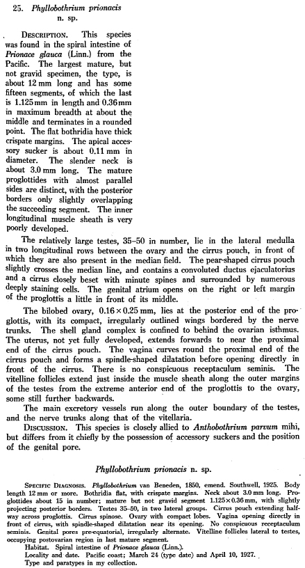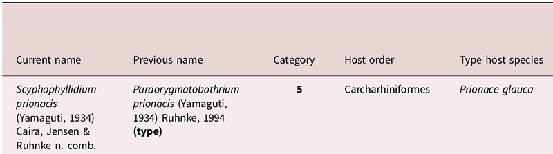 | Synonyms | Phyllobothrium prionacis Yamaguti, 1934; Crossobothrium prionacis (Yamaguti, 1934) Williams, 1968; Paraorygmatobothrium prionacis (Yamaguti, 1934) Ruhnke, 1994 |