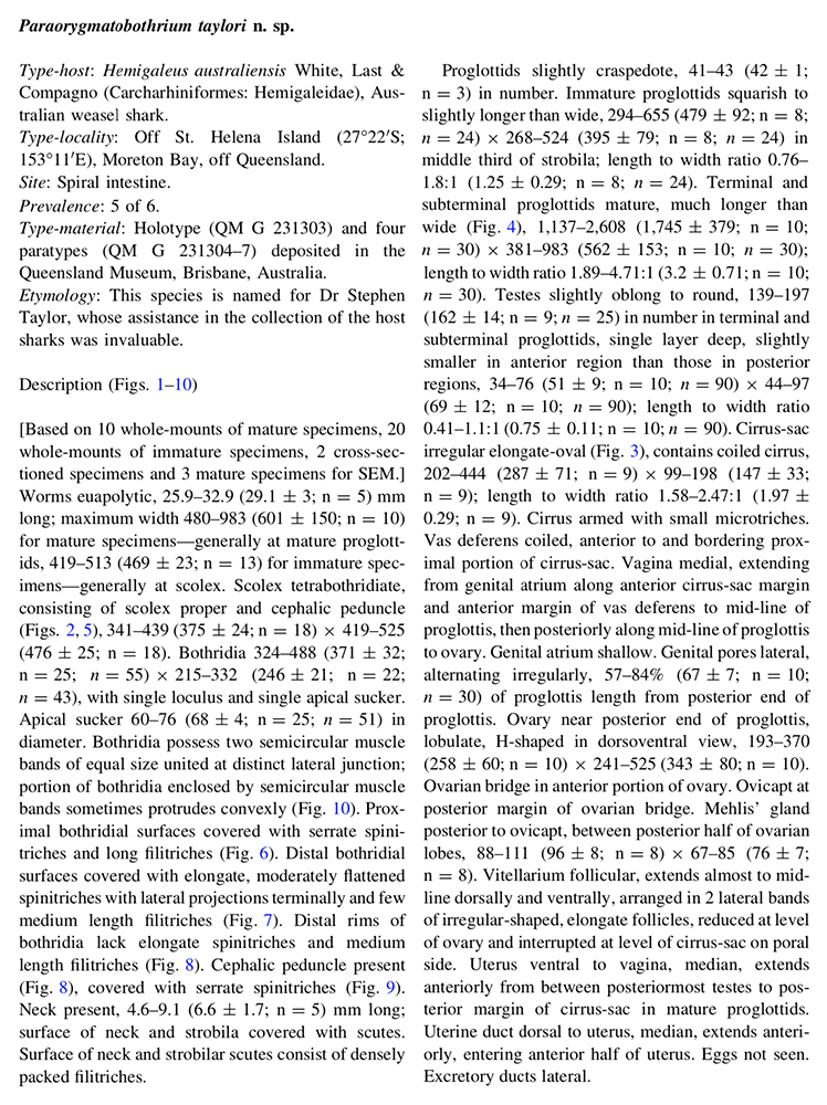 Cutmore, S. C., M. B. Bennett, and T. H. Cribb. 2009. Paraorygmatobothrium taylori n. sp. (Tetraphyllidea: Phyllobothriidae) from the Australian weasel shark Hemigaleus australiensis White, Last & Compagno (Carcharhiniformes: Hemigaleidae). Systematic Parasitology 74: 49-58. (4520) Download PDFCaira, J. N., K. Jensen, C. Hayes and T. R. Ruhnke. 2020. Insights from new cestodes of the crocodile shark, Pseudocarcharias kamoharai (Lamniformes: Pseudocarchariidae), prompt expansion of Scyphophyllidium and syonymization of seven phyllobothriidean genera—at last!. Journal of Helminthology (https://doi.org/10.1017/S0022149X20000036): 1–24. (7164) Download PDF |