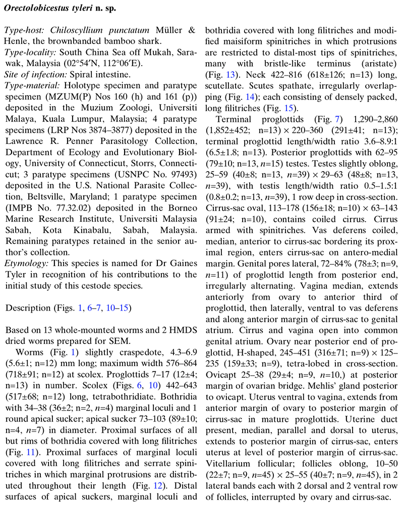 Ruhnke, T. R., J. N. Caira, and S. D. Carpenter. 2006. Orectolobicestus n. g. (Cestoda: Tetraphyllidea), with the description of five new species and the transfer of Phyllobothrium chiloscyllii to the new genus. Systematic Parasitology 65: 215-233. (4453) Download PDFCaira, J. N., K. Jensen, C. Hayes and T. R. Ruhnke. 2020. Insights from new cestodes of the crocodile shark, Pseudocarcharias kamoharai (Lamniformes: Pseudocarchariidae), prompt expansion of Scyphophyllidium and syonymization of seven phyllobothriidean genera—at last!. Journal of Helminthology (https://doi.org/10.1017/S0022149X20000036): 1–24. (7164) Download PDF |