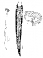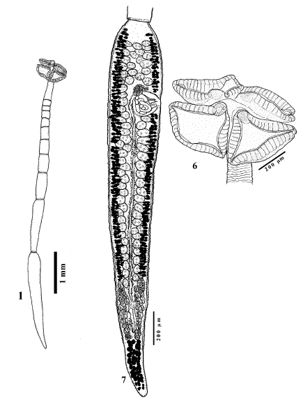 Fig 1. 1. Orectolobicestus tyleri n. sp., entire holotype (MZUM(P) No. 160 (h)). Figs. 6–7 Orectolobicestus tyleri n. sp. 6. Scolex of holotype (MZUM(P) No. 160 (h)). 7. Terminal proglottid of holotype (MZUM(P) No. 160 (h)).