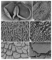 Figs. 10–15 Scanning electron micrographs of Orectilobicestus tyleri n. sp. 10. Scolex. White numbers indicate locations at which Figs. 11–14 were taken. 11. Proximal surface of bothridium, not on surface of marginal loculus. 12. Proximal surface of bothridium at marginal loculus. 13. Distal surface of bothridium; inset provides enlarged view of distal surface microtriches. 14. Scutes on anterior regions of strobila. 15. Enlarged view of scutes; note scutes composed of elongate filitriches. Scale-bars: 10, 200 µm; 11–13,15, 2 µm; 13 (inset), 1 µm; 14, 20 µm