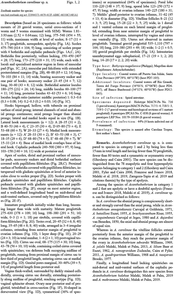 Franzese, S. and V. A. Ivanov. 2020. Two new species of Acanthobothrium Blanchard, 1848 (Cestoda: Onchoproteocephalidea) from rajiform batoids off Argentina. Folia Parasitologica 67(16): . (7194) Download PDF |
