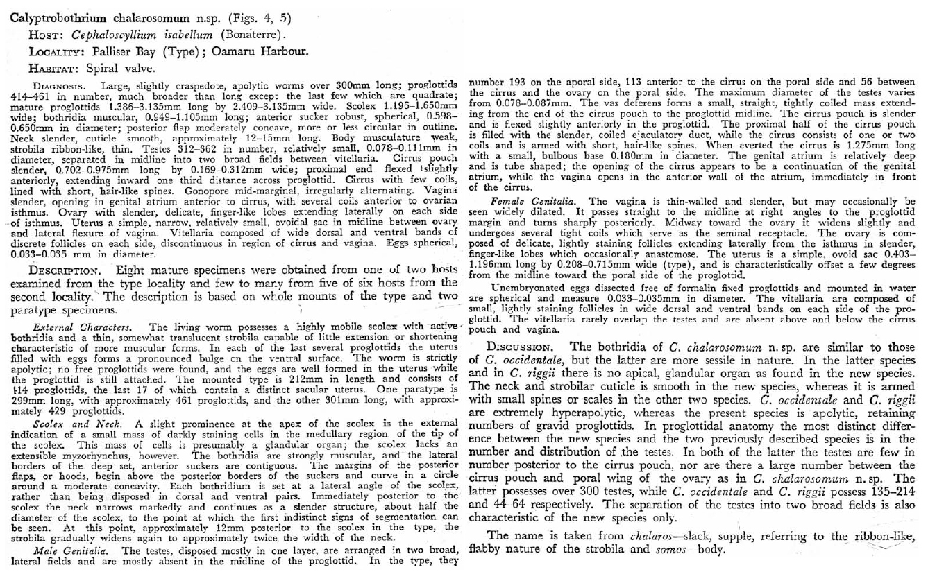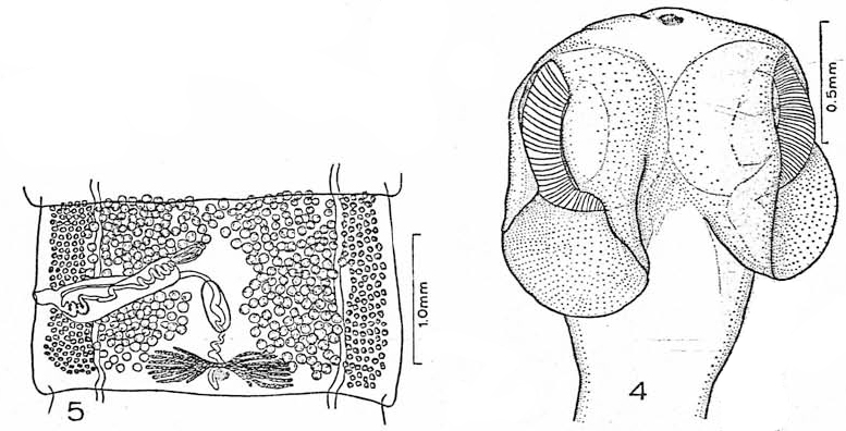 Text-Fig. Calyptrobothrium chalarosomum n.sp. 4, Scolex. 5, Mature proglottid.
