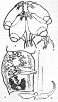 Figs. A-D Uncibilocularis shastri sp. nov. A. Scolex, B. Hooks, C. Mature segment, D. Cirrus [sic] pouch