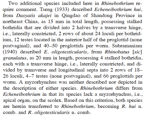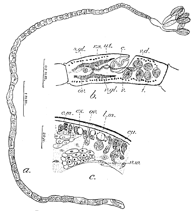 FIGURE 1 Echeneibothrium oligotesticularis sp. nov. a. Holotype - entire worm. b. A proglottid. c. Transverse section showing structure of body wall. Abbreviations: c, cirrus inside pouch; c.m., circ... MoreFIGURE 1 Echeneibothrium oligotesticularis sp. nov. a. Holotype - entire worm. b. A proglottid. c. Transverse section showing structure of body wall. Abbreviations: c, cirrus inside pouch; c.m., circular muscles; cu., cuticle; ex., excretory vessels in the sub-cuticular layer; l.m., longitudinal muscle bundles; ov., ovary; r.s., receptacleum seminis; s.gl., shell gland; t., testis; ut.,uterus; v., vagina; v.d., vas deferens; v.gl., vitelline glands; v.w., wall of cirrus pouch. |