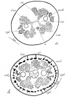 FIGURE 2. Echeneibothrium oligotesticularis sp. nov. a. Transverse section passing through the commissure of the ovary. b. Transverse section passing through shell gland. Abbreviations: c.c., centra... MoreFIGURE 2. Echeneibothrium oligotesticularis sp. nov. a. Transverse section passing through the commissure of the ovary. b. Transverse section passing through shell gland. Abbreviations: c.c., central commissure of ovary; d. ov., dorsal lobe of ovary; ex. d., main excretory duct; l.m., longitudinal muscle bundles; s.gl., shell gland; ut.,uterus; v., vagina; v.d., vas deferens; v. d1., vitelline duct; v.gl., vitelline glands; v. ov., ventral lobe of ovary. |