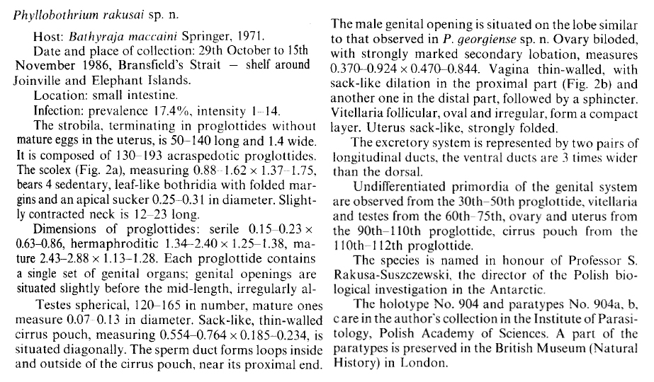 Wojciechowska, A. 1991. New species of the genus Phyllobothrium (Cestoda, Tetraphyllidea) from Antarctic batoid fishes. Acta Parasitologica Polonica 36: 63-68.