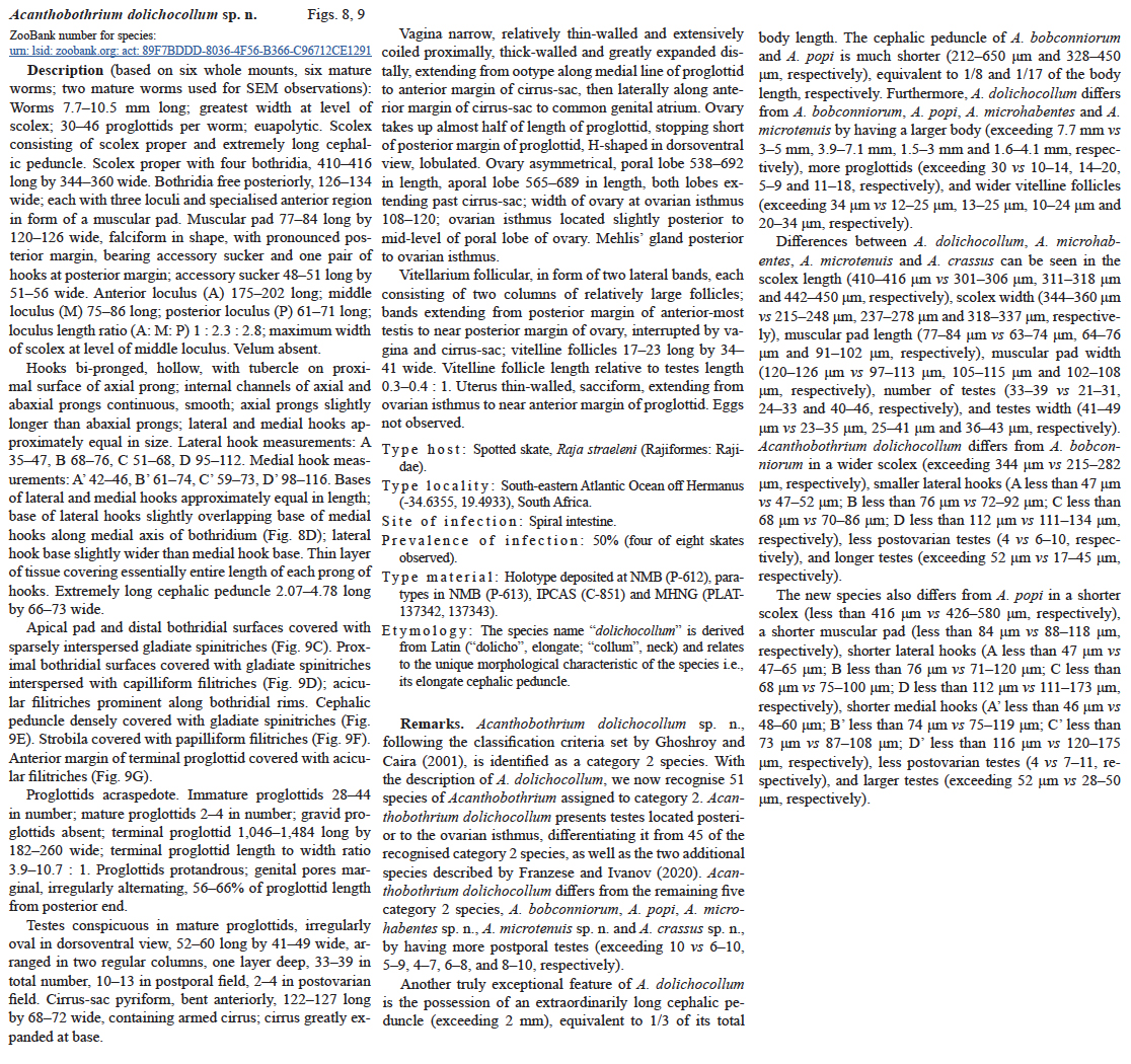 Van Der Spuy, L., N. J. Smit, and B. C. Schaeffner. 2020. Four new species of Acanthobothrium van Beneden, 1849 (Cestoda: Onchoproteocephalidea) from the spotted skate, Raja straeleni Poll, off the Western Cape, South Africa. Folia Parasitologica 67: 036. (7225) Download PDF |
