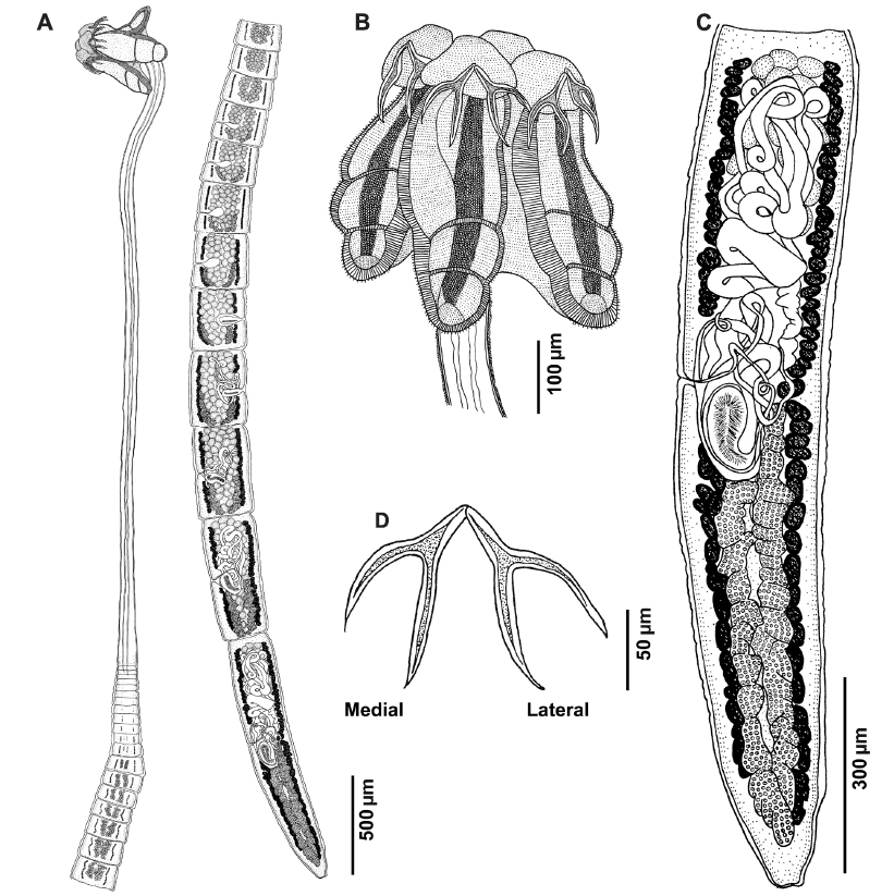 Fig. 8. Line drawing of Acanthobothrium dolichocollum sp. n. A – entire specimen; B – scolex; C – mature proglottid; D – hooks.