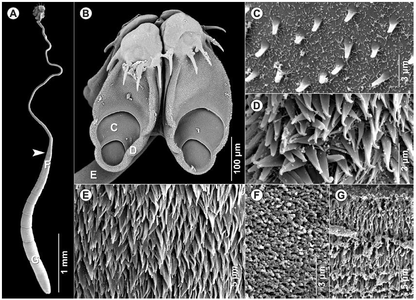 Fig. 9. Scanning electron micrographs of Acanthobothrium dolichocollum sp. n. A – entire specimen; arrow indicates termination of cephalic peduncle, letters indicate where micrographs of microtriches were taken; B – scolex, dorsoventral view, letters indicate where micrographs of microtriches were taken; C – distal bothridial surface; D – proximal bothridial surface near medial margin of bothridium; E – cephalic peduncle; F – first proglottid; G – anterior region of terminal proglottid.