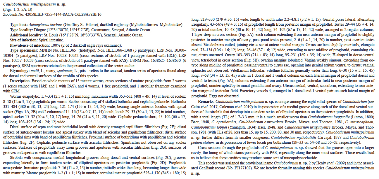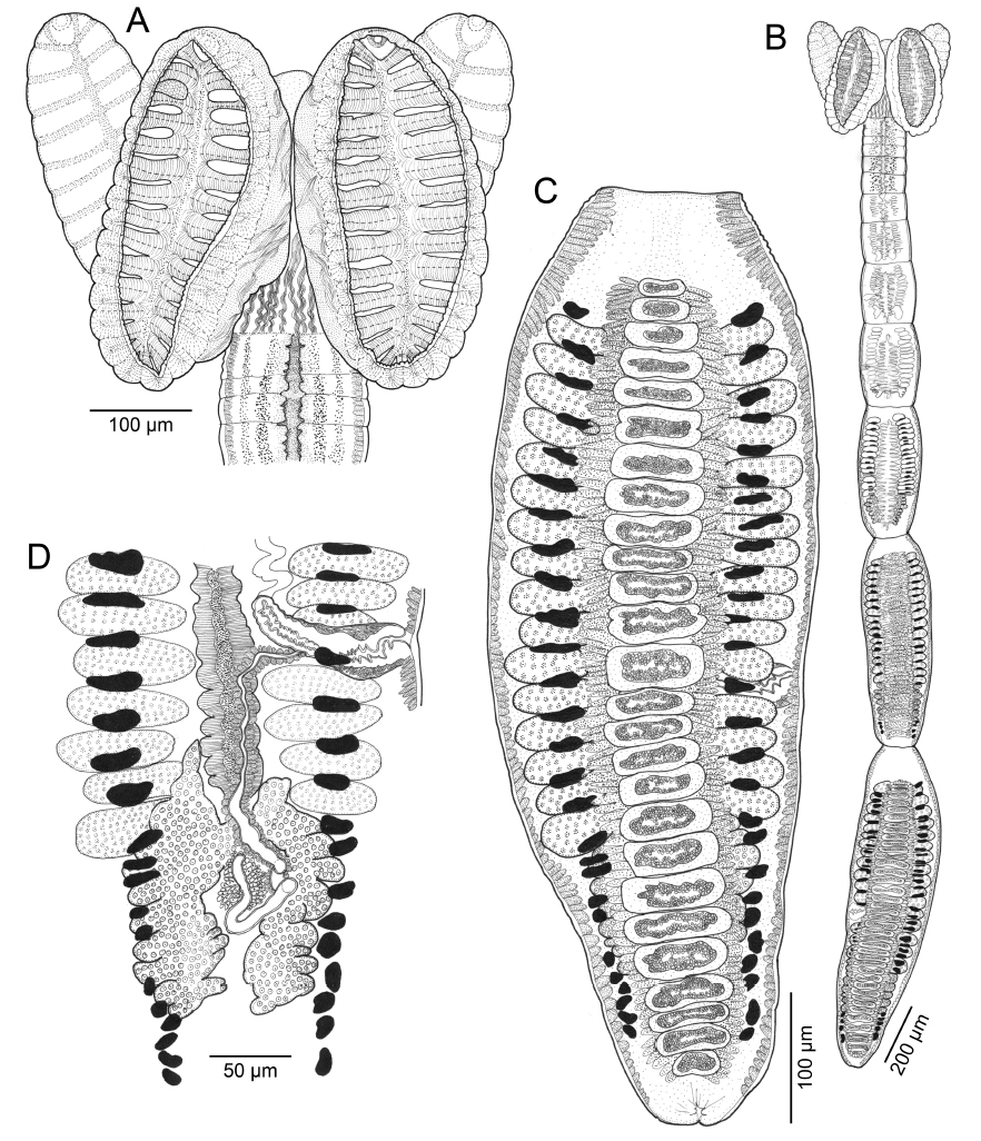 | Type Material | MNHN No. HEL1365 (holotype); Nos. HEL1366–1368 (3 paratypes); LRP Nos. 10300–10304 (5 paratypes), LRP Nos. 10228–10242 (cross sections of strobila of 1 paratype stained with H&E); LRP Nos. 10257–10259 (cross sections of strobila of 1 paratype stained with PAS); USNM Nos. 1638625–1638630 (6 paratypes) |